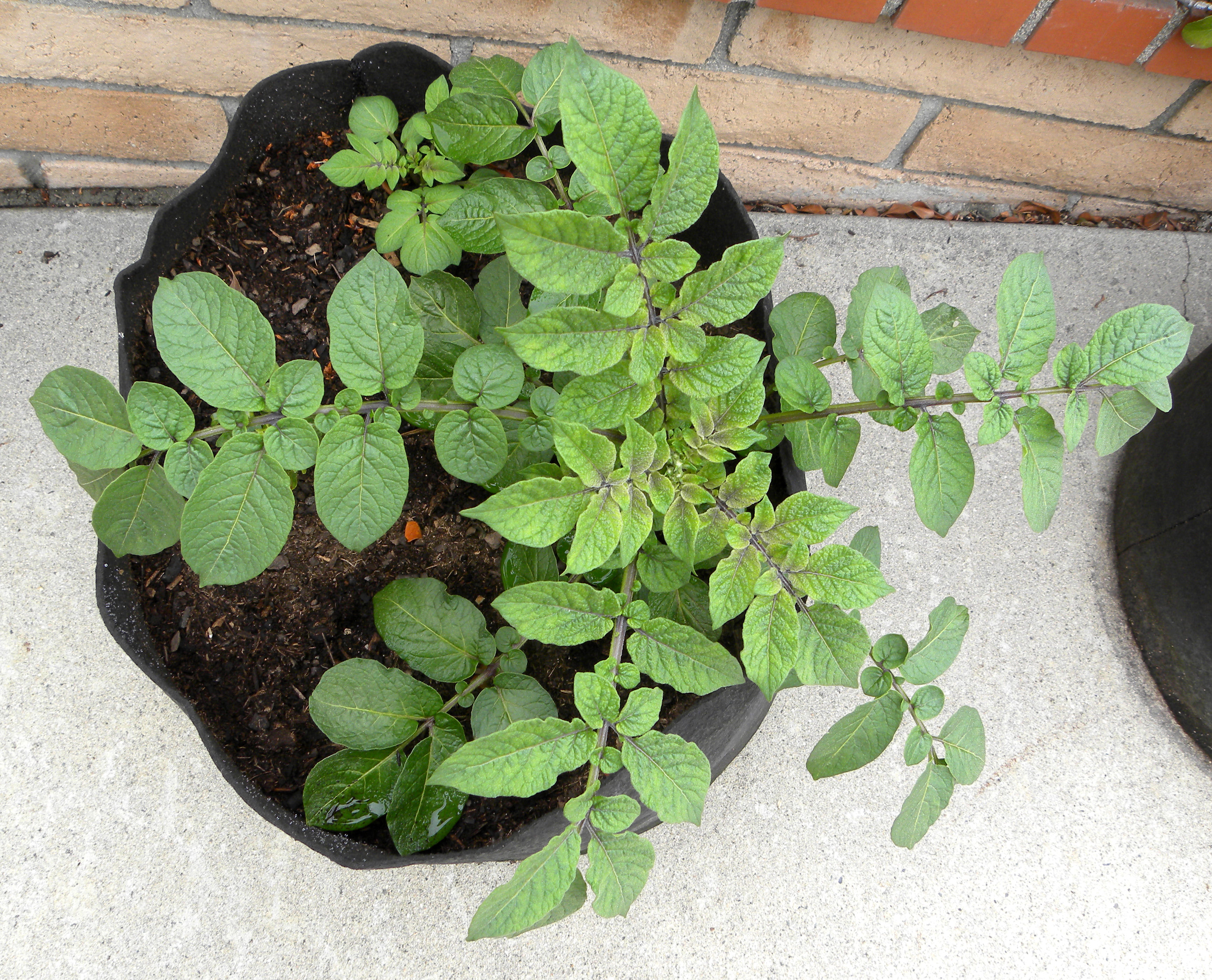 I grow potatoes and yams in Gro-pots in our driveway. Here is a pot of potatoes that volunteered from little potatoes that didn't get harvested. I won't know if they're German butterballs or blue potatoes until harvest time. They could even be Russets. I've grown them all in these fabric grow-pots. I just add more fertilizer and reuse the potting soil and pots.