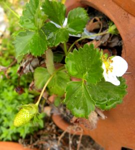 My strawberry pot got a bit neglected last year, but the strawberry plants survived. I fertilized and watered them, and am hoping for at least a small crop of berries this year.