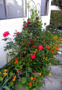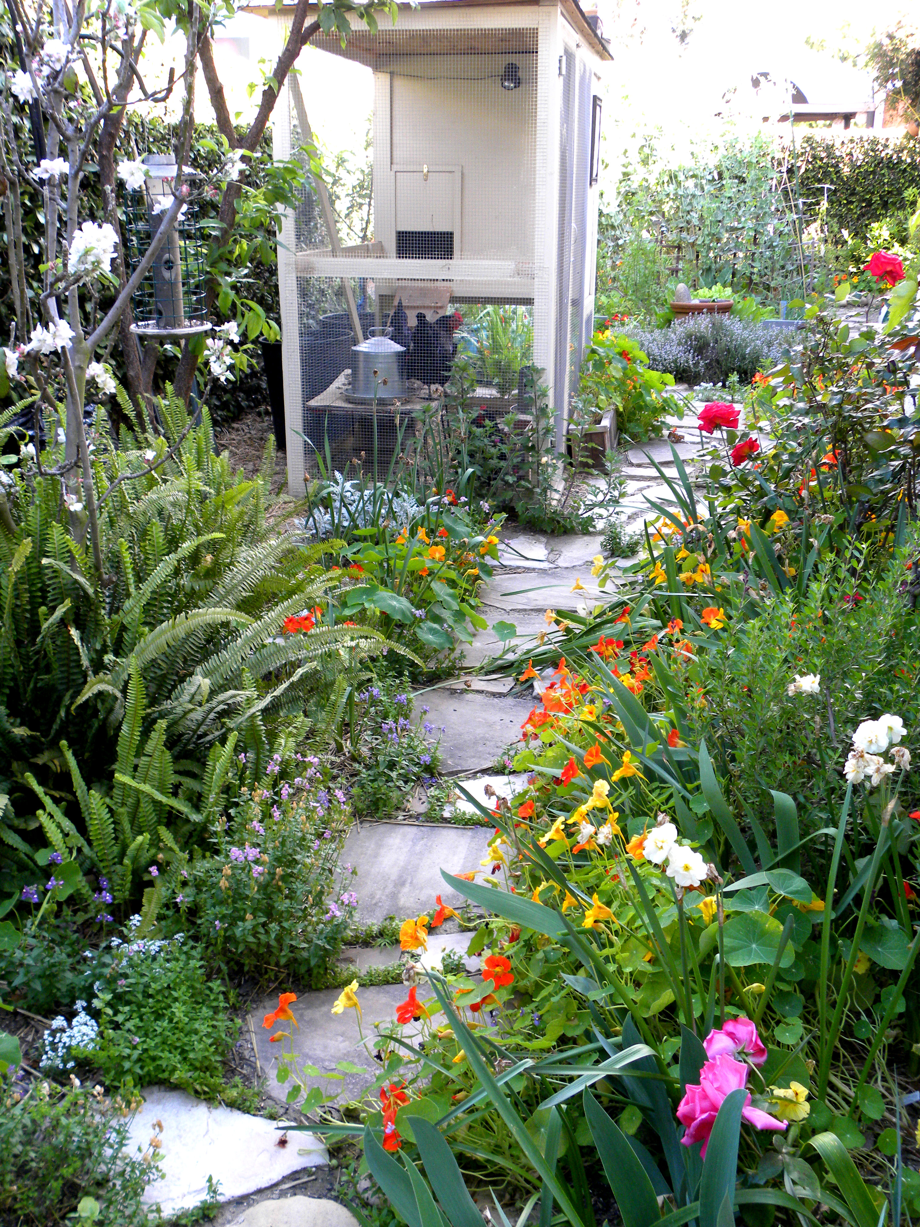 Pathway in back of house bordered by roses, grapes, narcissus, allysum, pansies, nasturtiums, Nemesia and fruit trees.