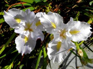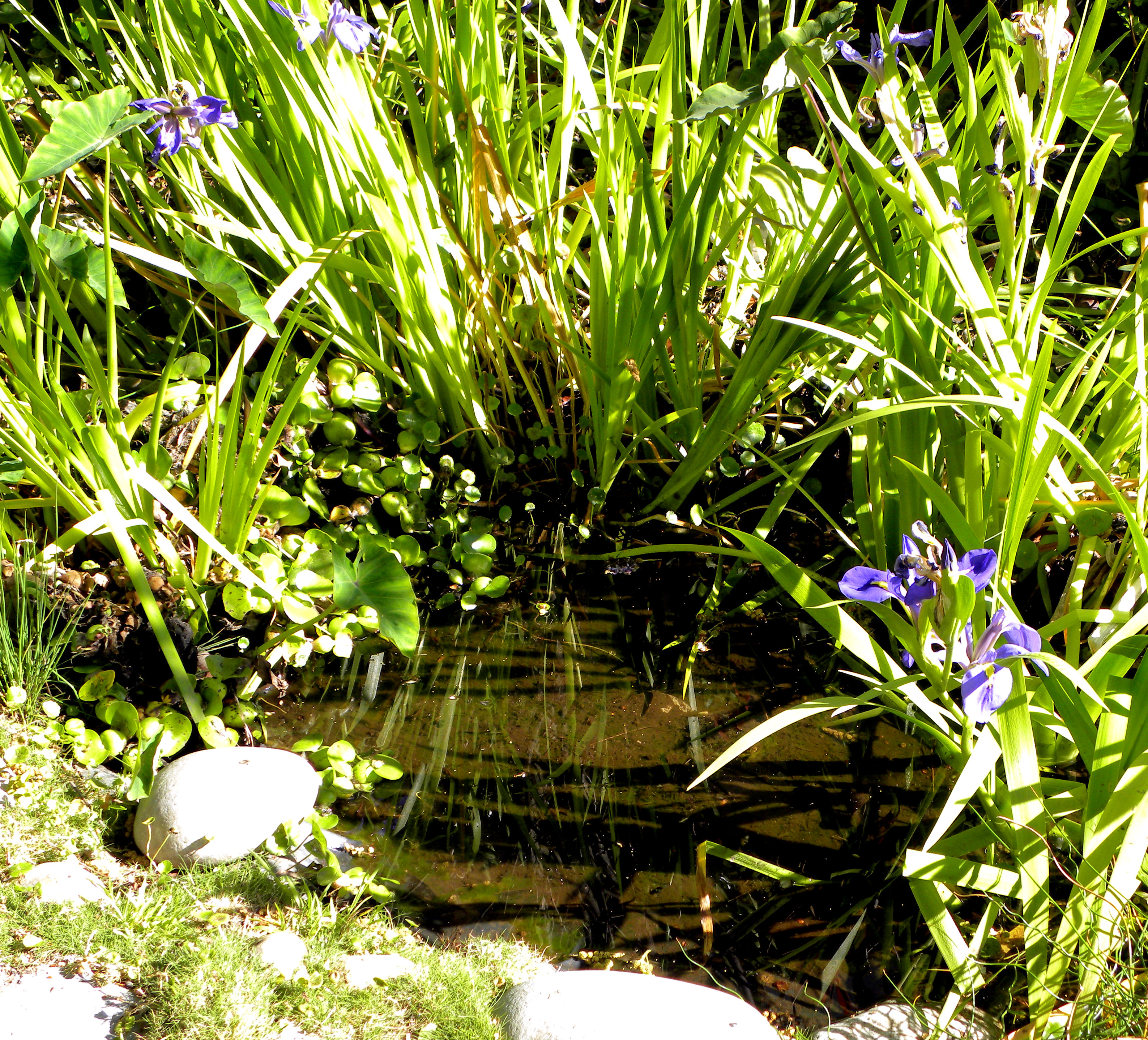 Irises are blooming in my small water garden in back framed by nasturtiums