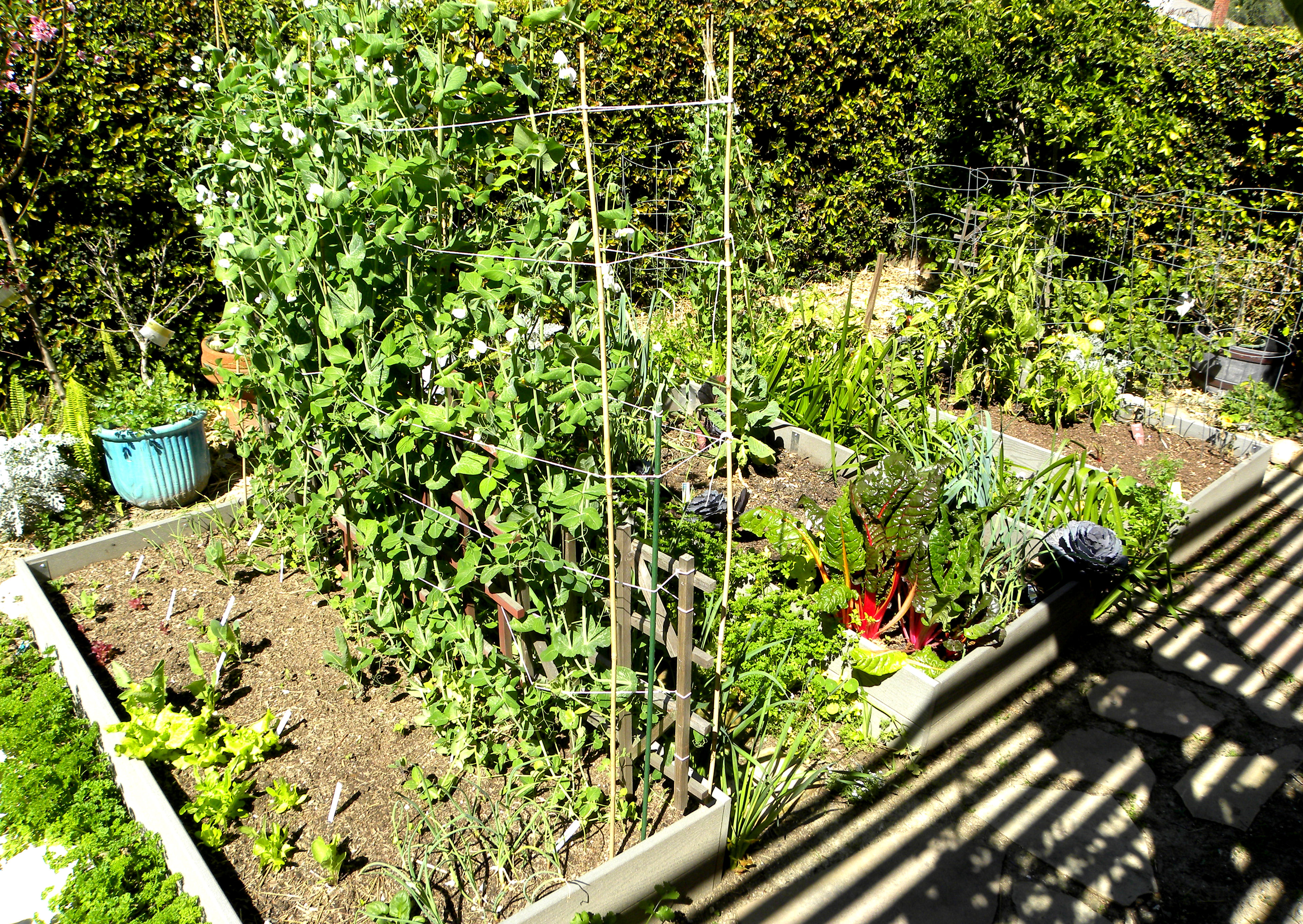 Raised bed #2 has chard, lettuce and leeks ready to harvest, plus garlic, red cabbage, white cauliflower, radishes, and Snow Wind Peas coming along.