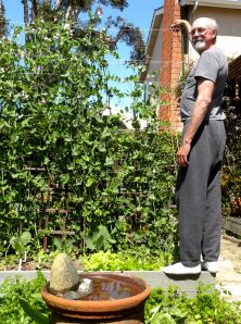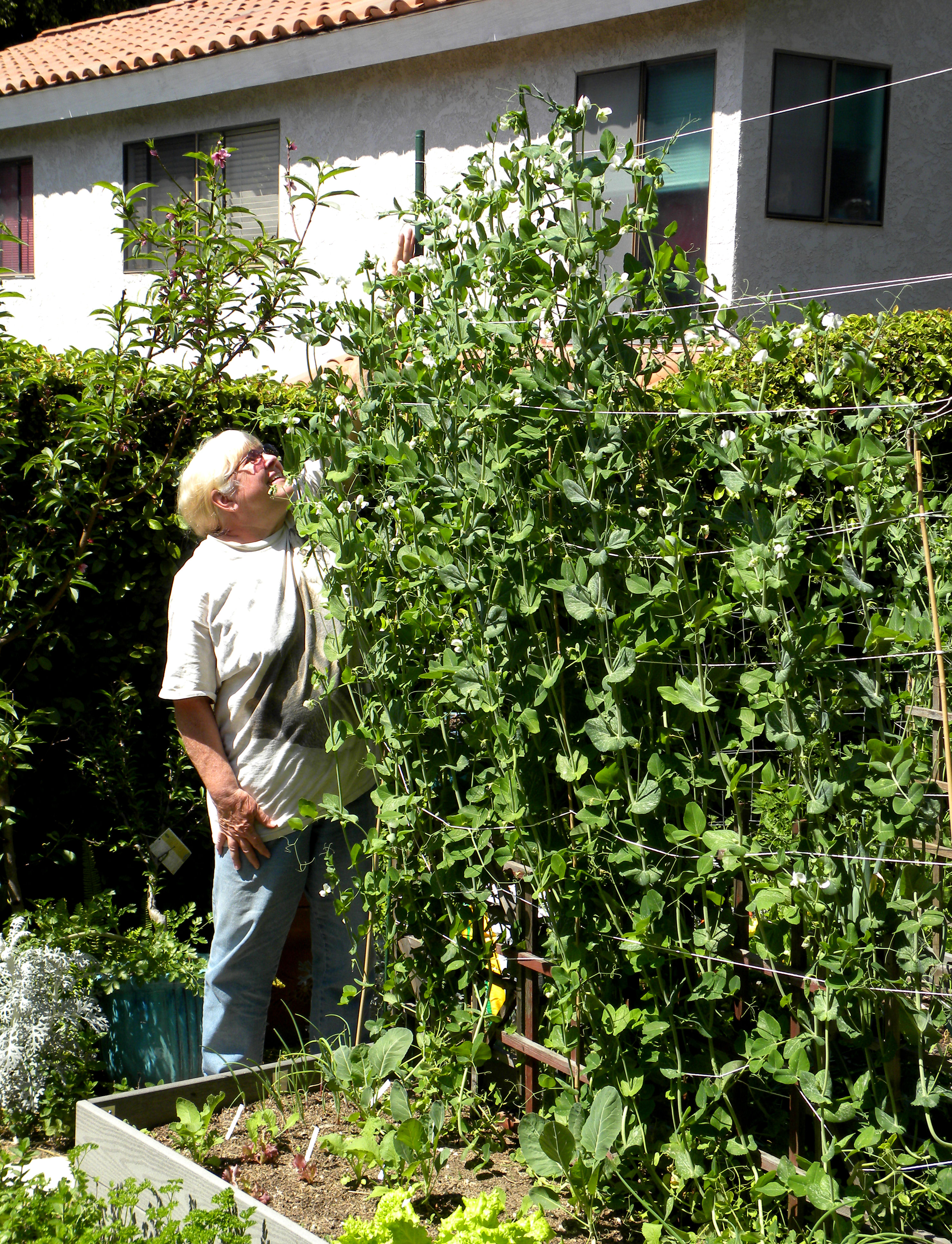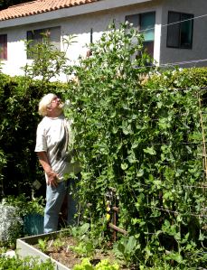 And the Super Sugar Snap Peas that ate Los Angeles are now a whopping 8 ft tall. Given that they’re in a raised bed, that means that I can no longer reach the peas to harvest them. I have no intention of pruning them. I’m thrilled that something in my garden grows so nicely.