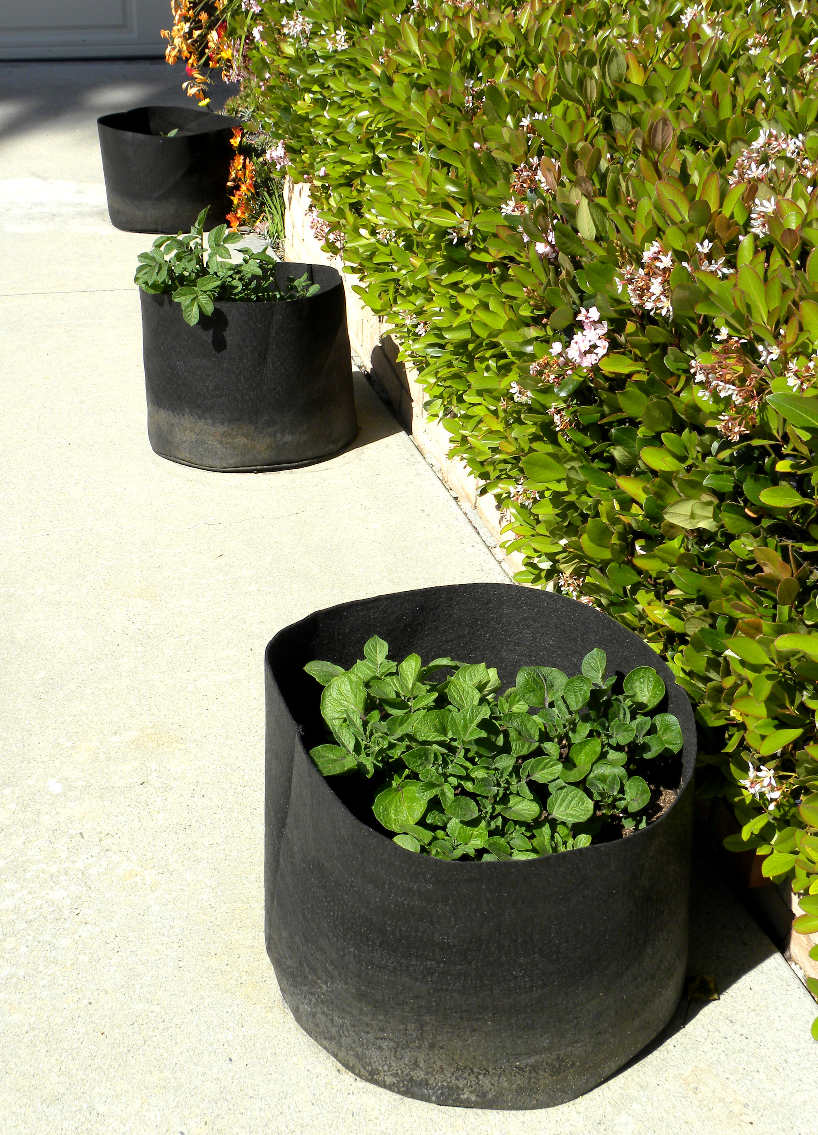 The blue potatoes in the first two Smart Pots are doing well, as are the sunchokes in the back left.