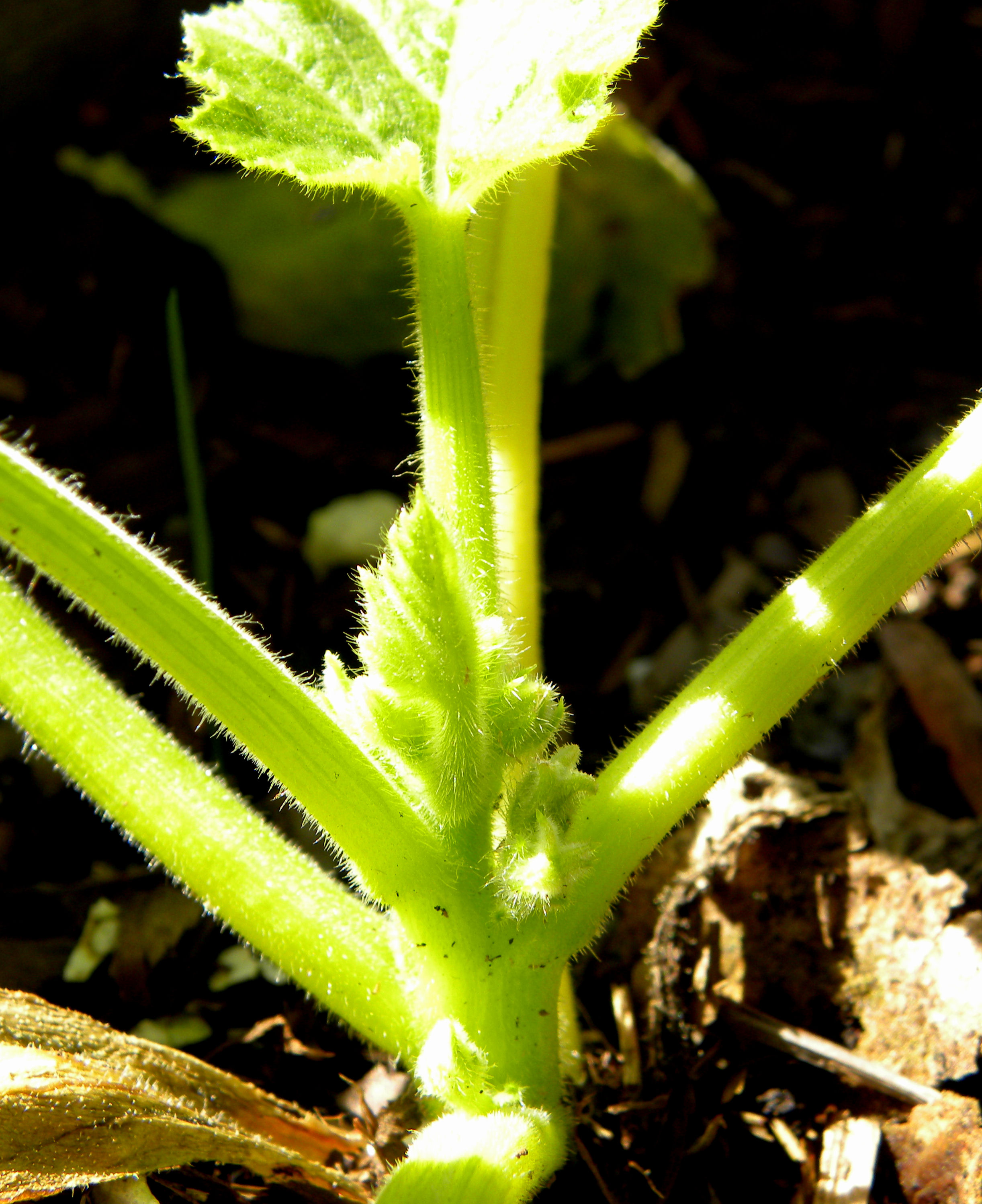I have three sunchoke sprouts above ground now. This one suffered some insect damage to the new shoot.