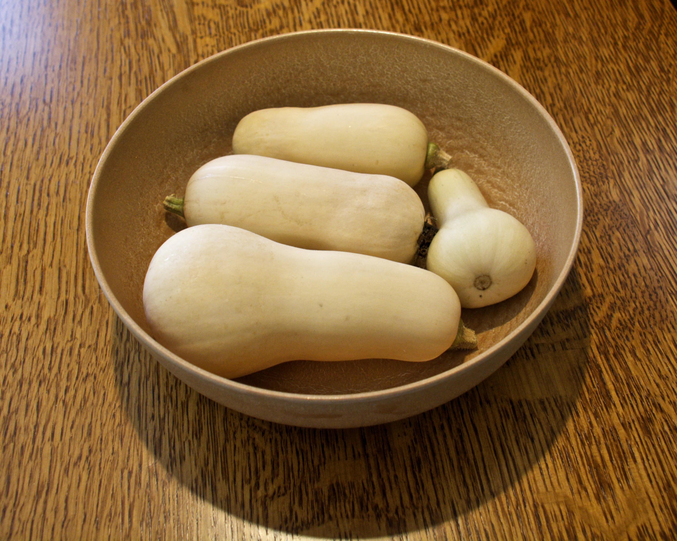 This is my entire butternut harvest from my back garden bed–another volunteer from the compost bin. It weighs just one pound, a tiny little guy.