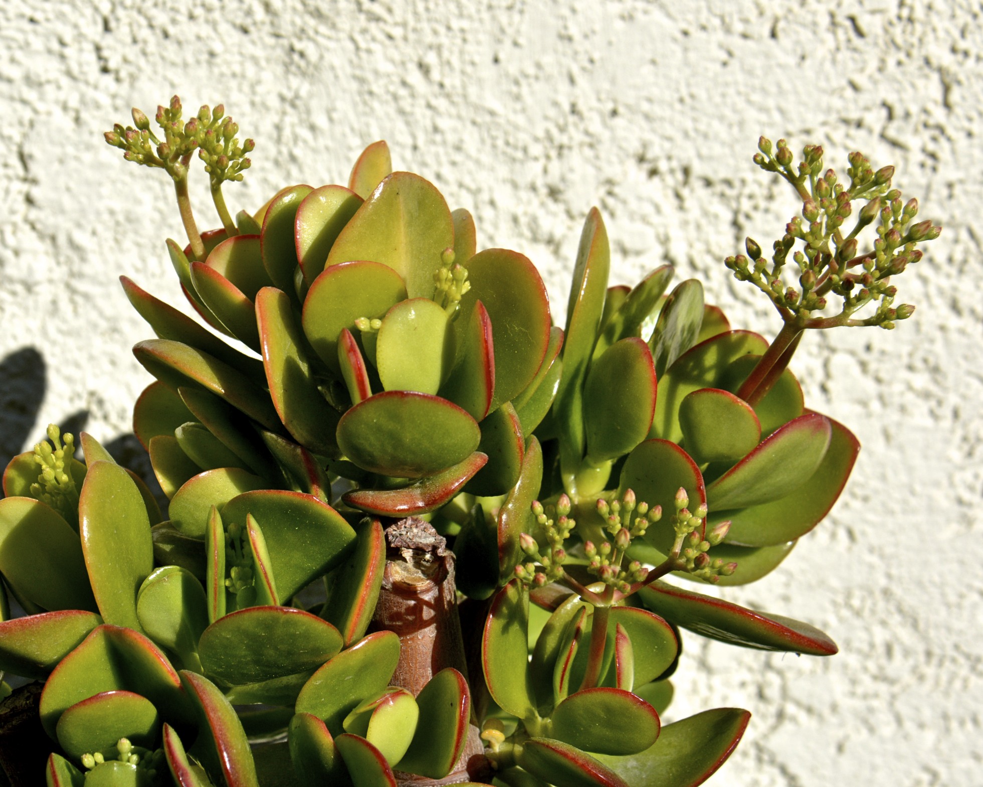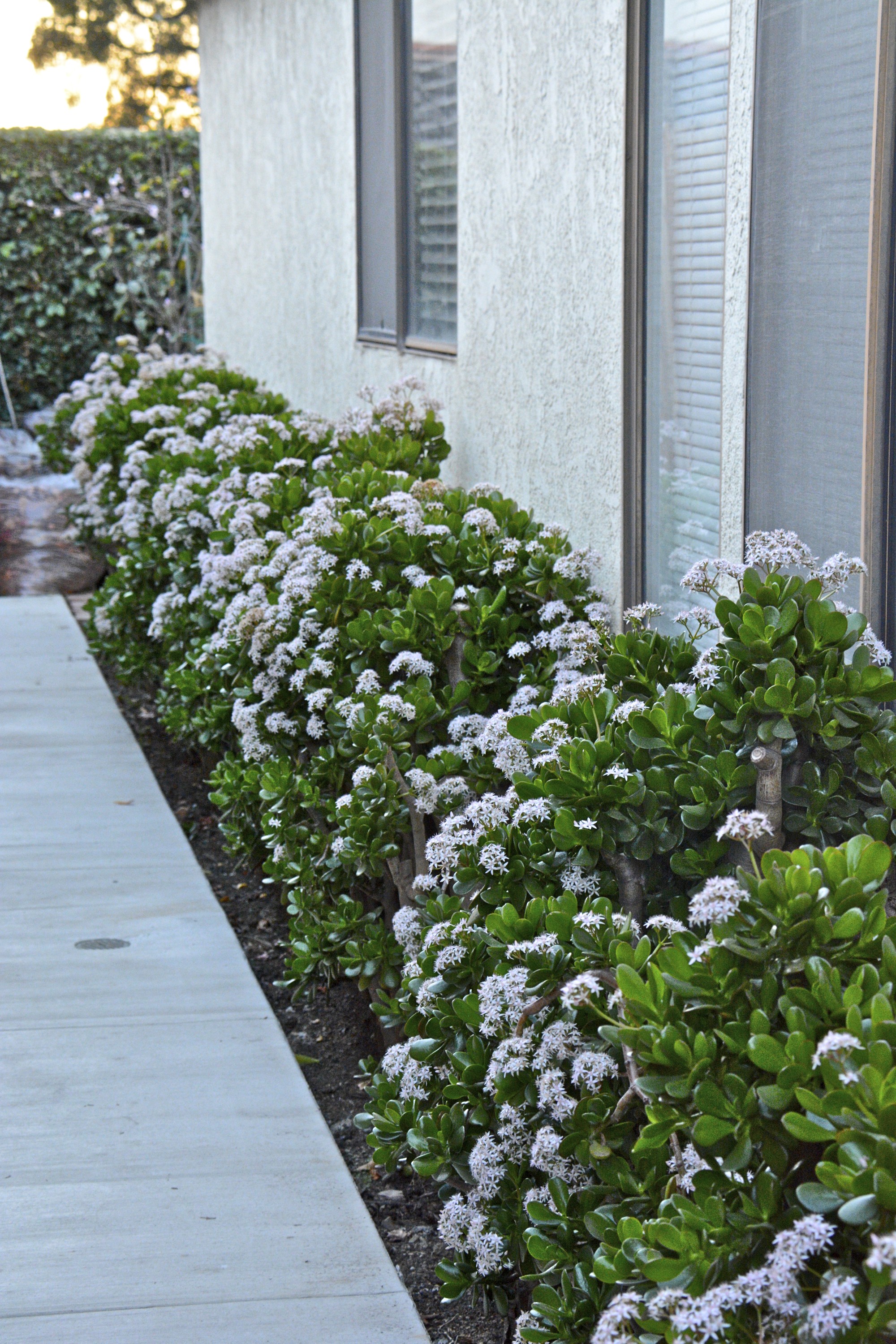 The row of jade plants has nearly finished blooming.