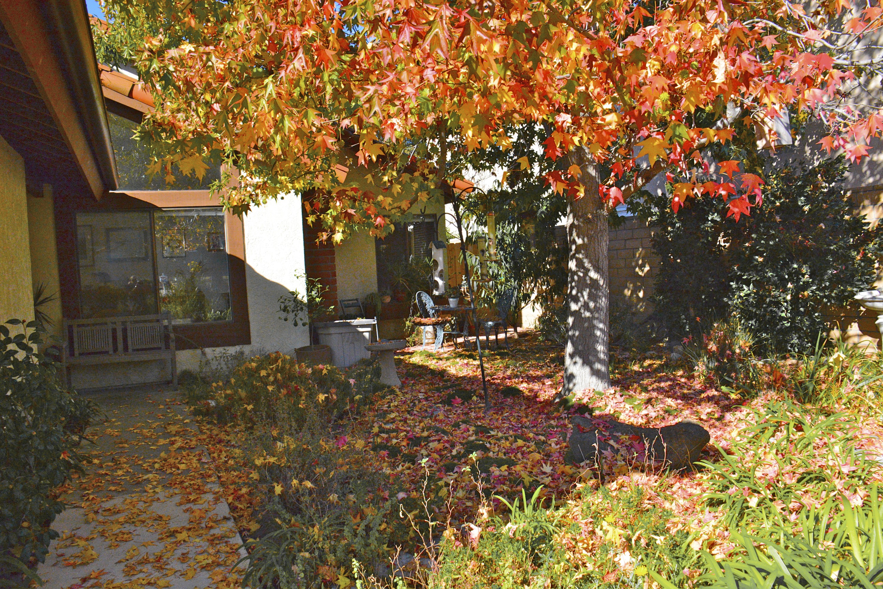 We just had the olive tree pruned to give my garden more sunlight. Check out that nice row of blooming yellow freesias in front.