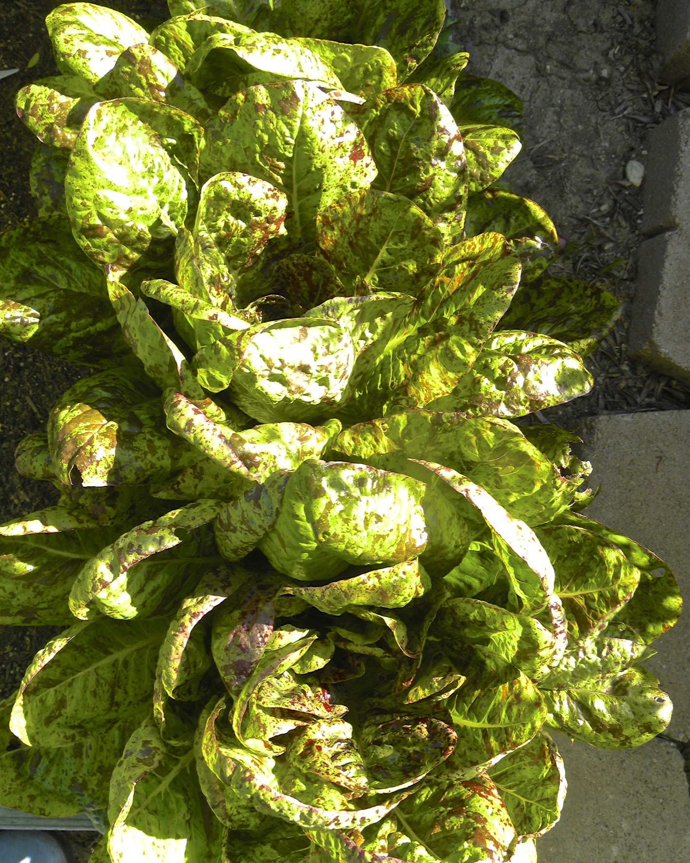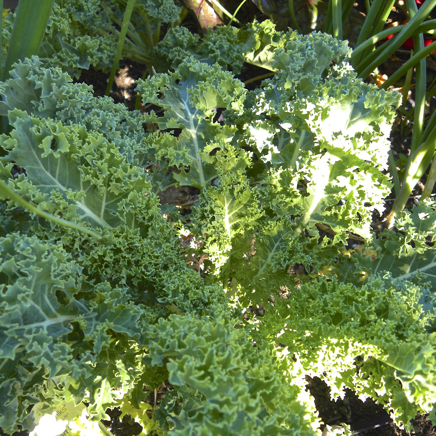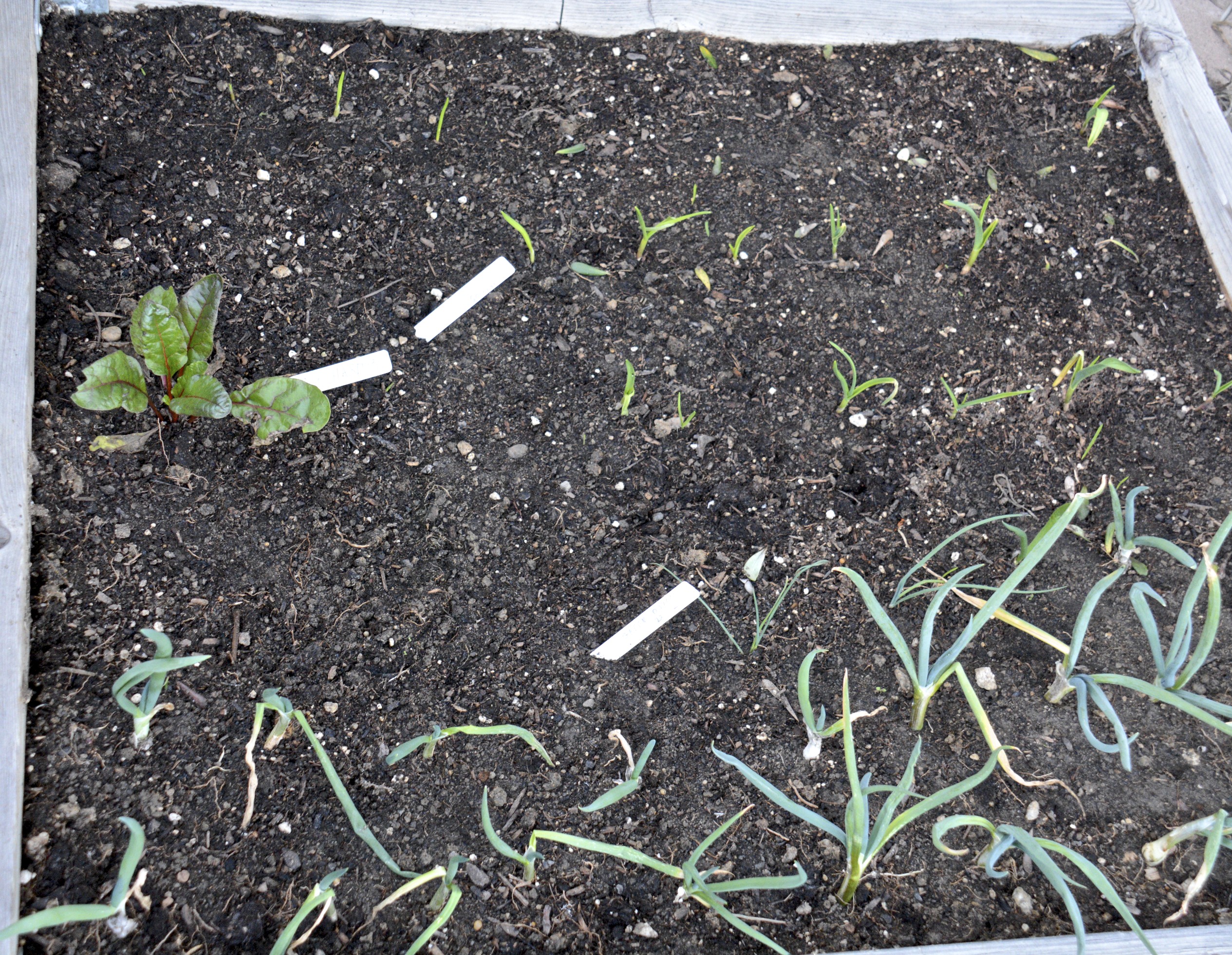 This little bed in front has green onions, some garlic, a volunteer sunflower, a chard, and some Freckles lettuce that has been decimated by birds.