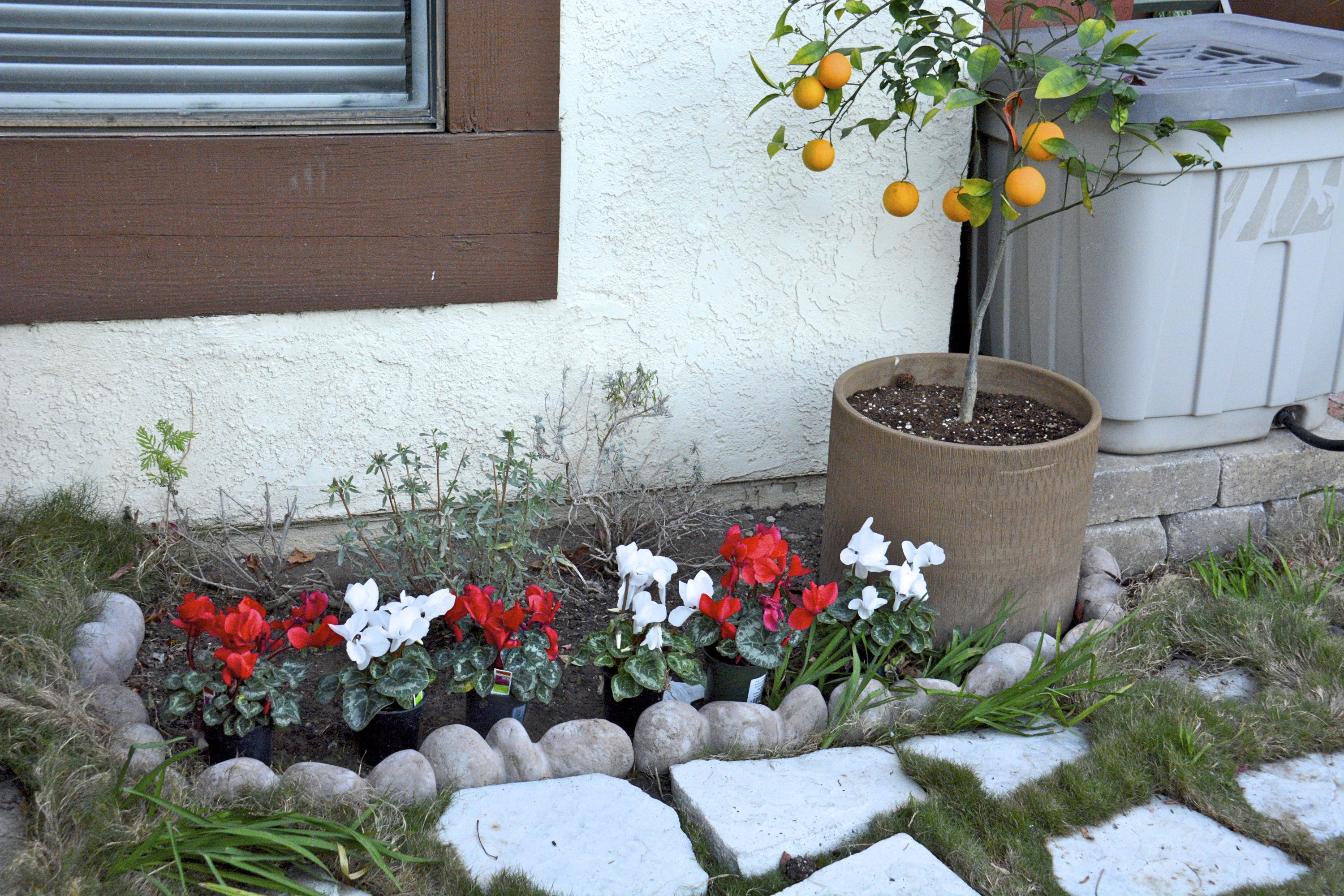 I just love this row of red and white cyclamen. But I still haven’t planted them. They are still in pots. So many plants, so little time.