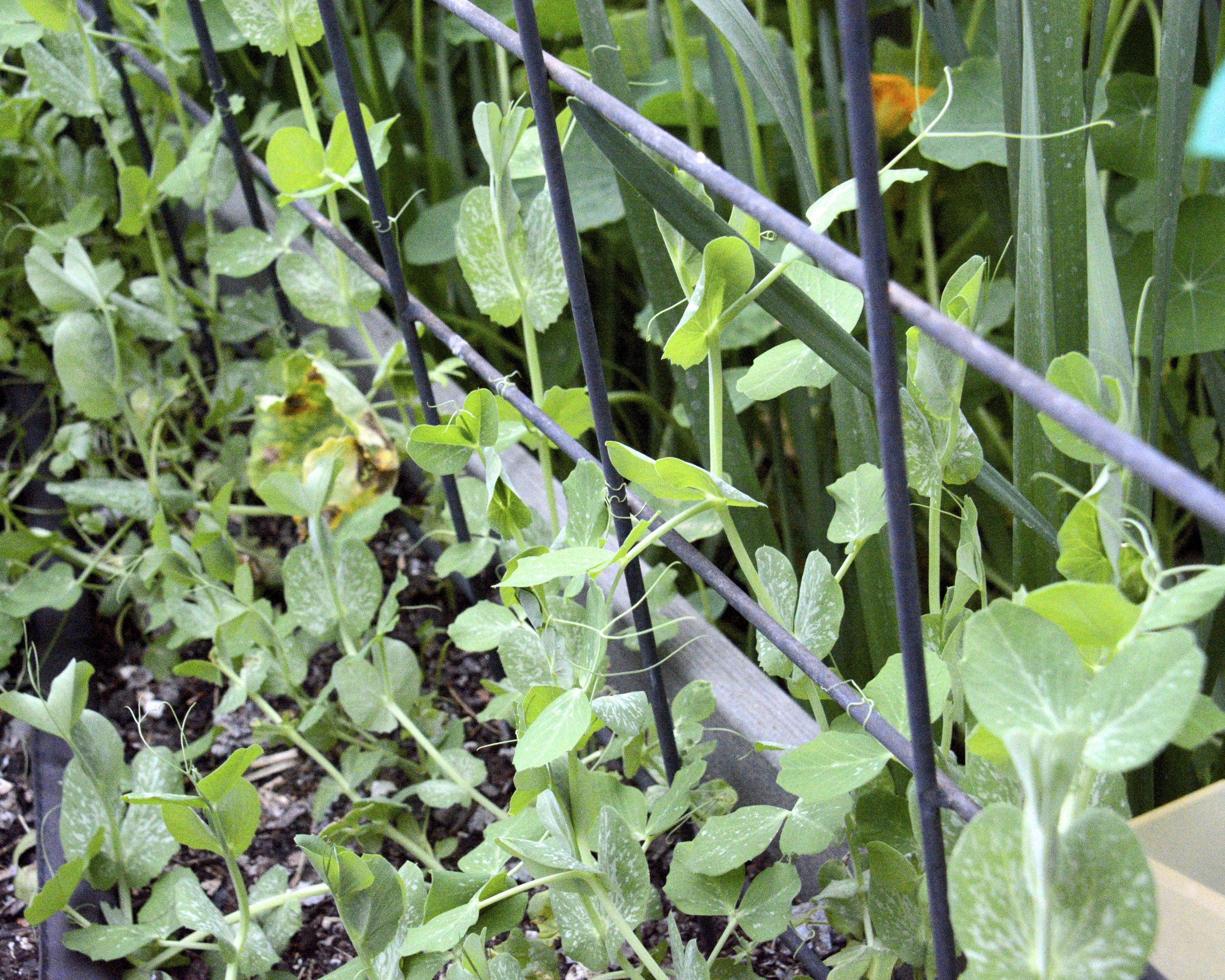 Don’t you just love pea flowers? I can hardly wait for our first snow peas. The birds ate my entire first planting, gobbled up the little seedlings as soon as they sprouted. The peas never had a chance. The birds are now attacking the tips of these huge pea plants. Naughty birds. I may need a net cover,