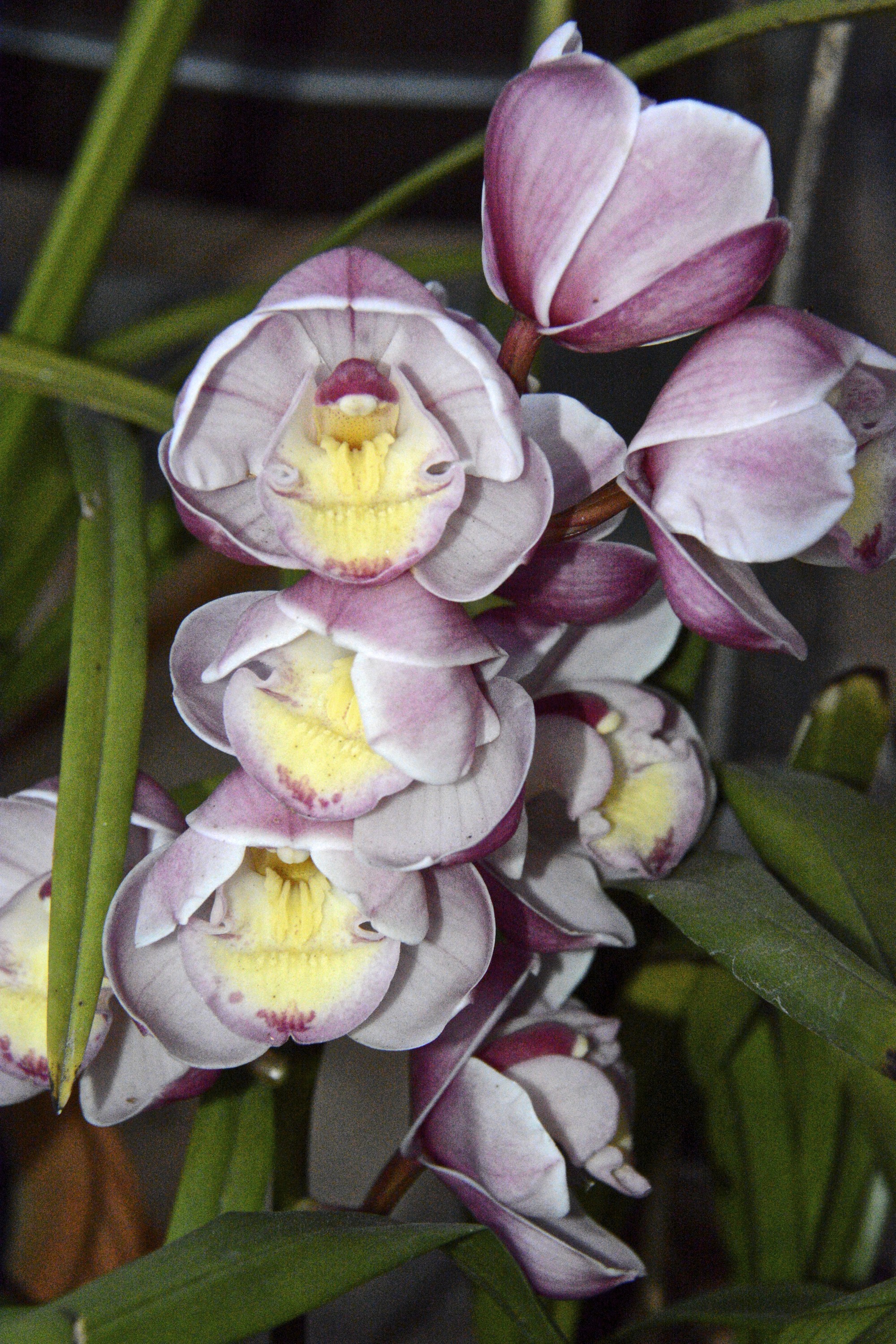 Pink cymbidium orchids bloom on the back deck. They have been blooming for weeks. The white ones aren’t open yet, so I get about 3-4 months of orchid bloom each spring.