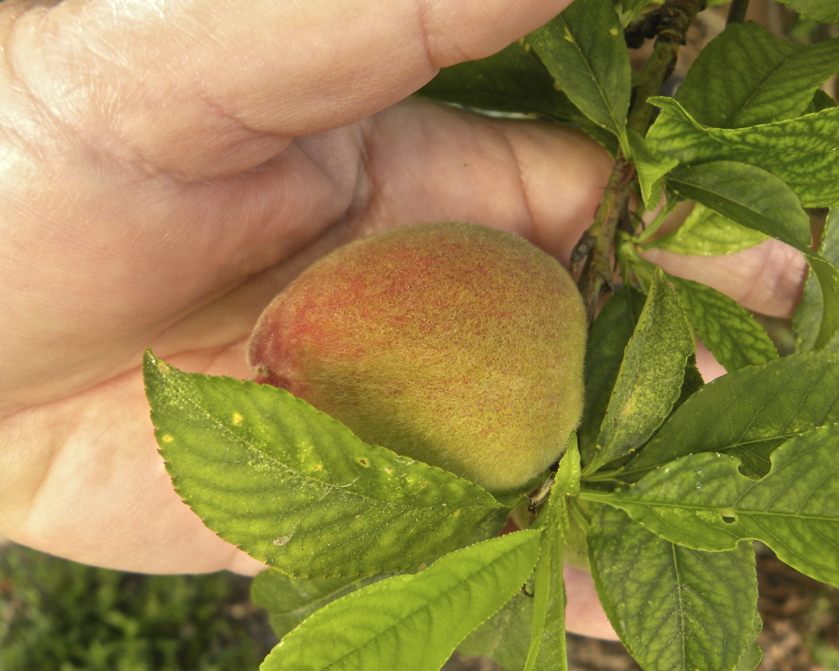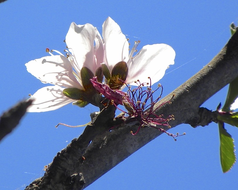 These are flowers on the August Pride peach tree in front. The Florida Prince has already finished blooming and is covered in little peaches. The Babcock Improved peach hasn’t bloomed yet, nor has the plum tree nor the Panamint or Snow Queen nectarines.
